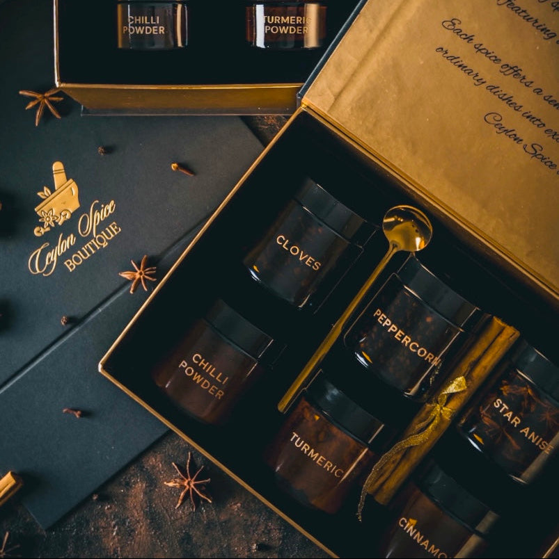 Discover the rich, aromatic spices of Sri Lanka with Ceylon Spice Boutique, a beautifully crafted collection of premium spices, sustainably sourced from the lush landscapes of Ceylon and Designed for spice lovers and culinary enthusiasts. This luxurious spice box brings the true essence of Ceylon to your kitchen.